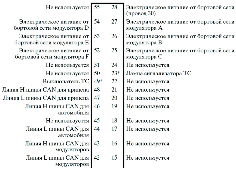• Разъем D предназначен для соединения с модуляторами, которые осуществляют управление торможением колес задних мостов. Модулятор управления тормозами прицепа также подключен к