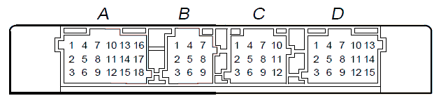 • В разъеме A находятся выводы для электрического питания от бортовой сети, для соединения с "массой", для соединения в элементами системы, которые расположены в кабине, и для соединения с общими элементами системы, которые не зависят от варианта конфигурации системы.