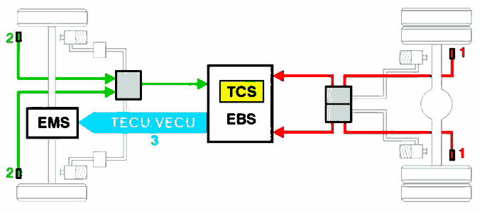 Получая информация о буксовании ведущих колес из системы EBS, система TCS противодействует буксованию, регулируя крутящий момент двигателя (EMS) и тормоза (EBS).