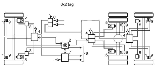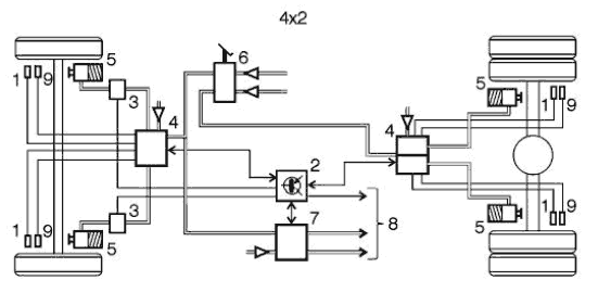 EBS распределяет тормозные усилия между мостами тягача, а также между тягачом и прицепом так, чтобы обеспечивалось соответствующее торможение.
