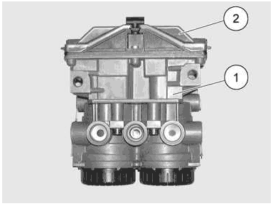 Аналогично 1-канальному модулю регулировки давления модуль управления прицепом (1) состоит из ускорительного клапана с 2 камерами управления для рабочей тормозной системы, одной камеры управления для стояночной тормозной системы, фильтра, дроссельного клапана, электромагнитных клапанов (впускного, выпускного, запасного), датчика давления, а также интегрированного блока управления (2).