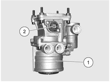 Модуль регулировки давления (1) на переднем мосту представляет собой 1-канальный электропневматический компонент. Модуль состоит из ускорительного клапана, фильтра, глушителя, электромагнитных клапанов для резервного контура (резервного клапана), впускного и выпускного клапана, датчика давления, электроники регулировки (2), а также пневматических и электрических разъемов.