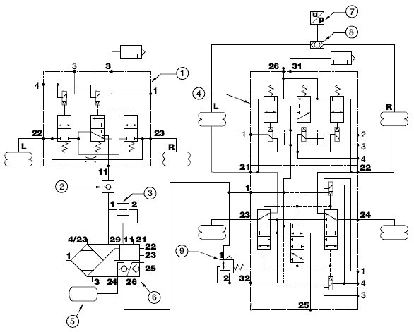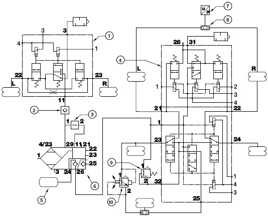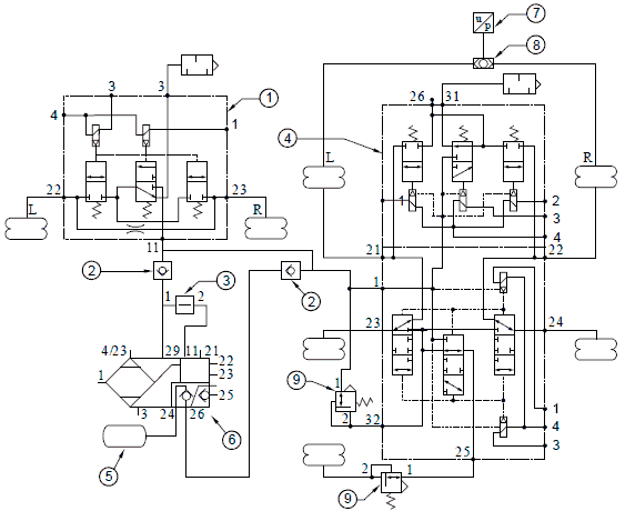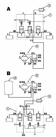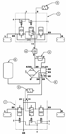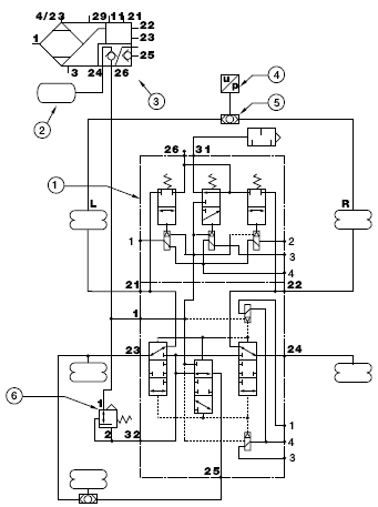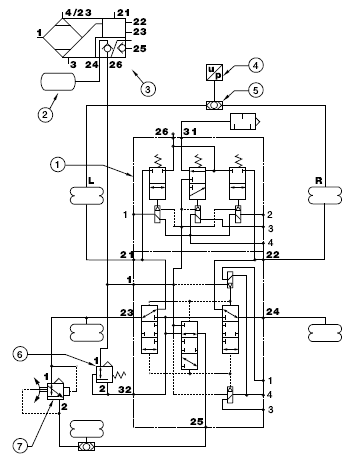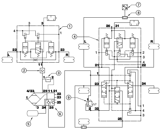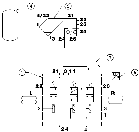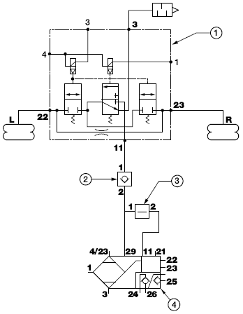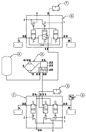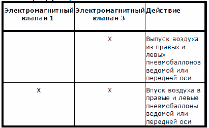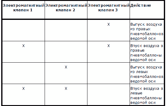 Чтобы опустить неведущую ось, воздух выпускается из пневмобаллонов подъема, и пневмобаллоны неведущей оси подключаются к пневмобаллонам ведущей оси.