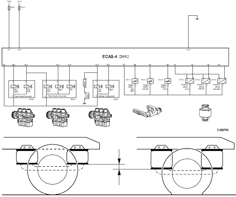 Высота шасси на уровне при движении сохраняется в памяти электронного блока. Датчик высоты (F612/F613/F614) регистрирует высоту шасси и отправляет данное значение в электронный блок. В блоке данное значение сравнивается с необходимой высотой шасси, сохраненной в памяти.