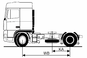 Нагрузки на оси также могут отображаться на автомобилях FT, оснащенных передней осью с листовой рессорой. Значение нагрузки на переднюю ось представляет собой вычисленное значение, которое получается на основе значения нагрузки на заднюю ось, колесной базы и положения седельно-сцепного устройства (KA-фактор).