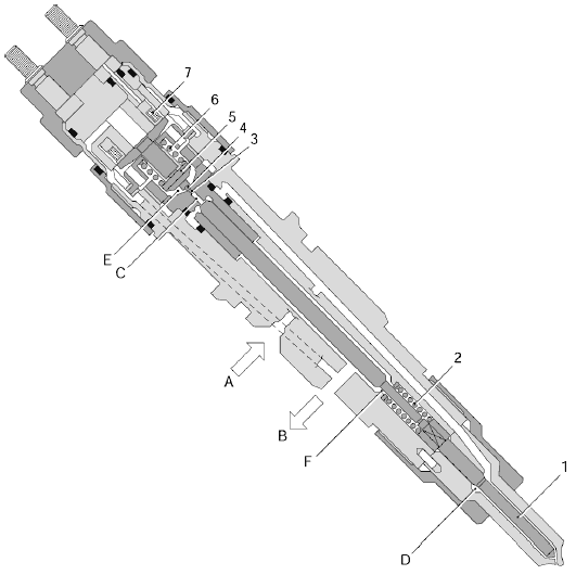 На торце топливной рампы установлен предохранительный перепускной клапан (6b). Если давление в топливной рампе становится чрезмерно высоким (в аварийной ситуации), данный клапан обеспечивает слив излишков топлива в сливной трубопровод. Сливной трубопровод соединен со сливным трубопроводом топливного бака (1).