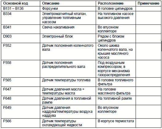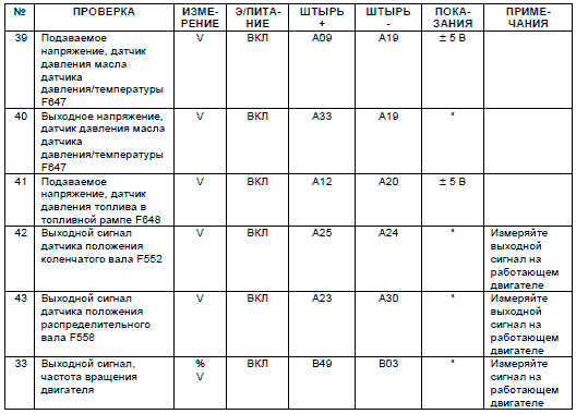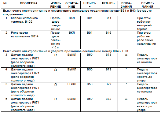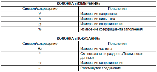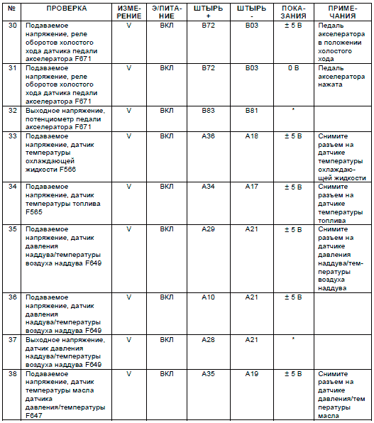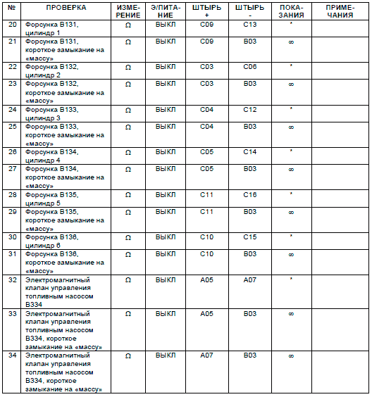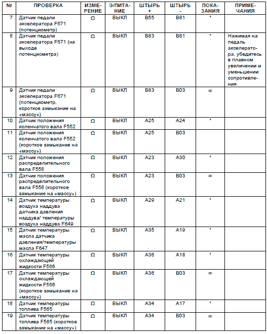 Показания, полученные при помощи универсального тестера ВОВ, могут несколько отличаться от показаний, перечисленных в колонке «показания», вследствие сопротивления контактов универсального тестера ВОВ и жгута проводов ВОВ.