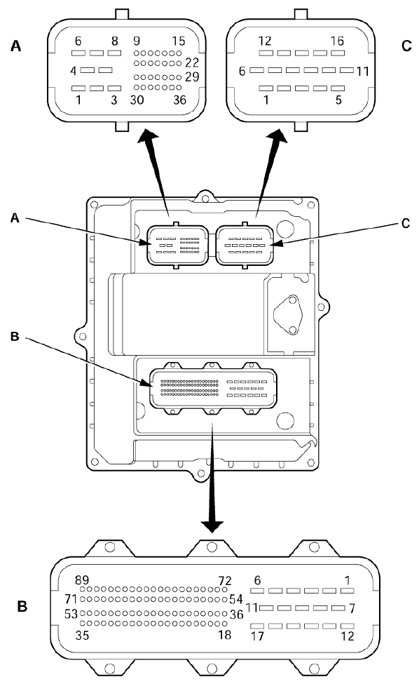 Электронный блок снабжен тремя разъемами: разъемы А, В и С.