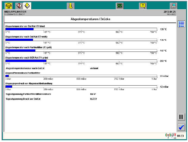 Отображается относительное давление ОГ, т. е. текущее давление по отношению к атмосферному давлению перед окислительным нейтрализатором для компенсации давления датчика NOx и лямбда-зонда.