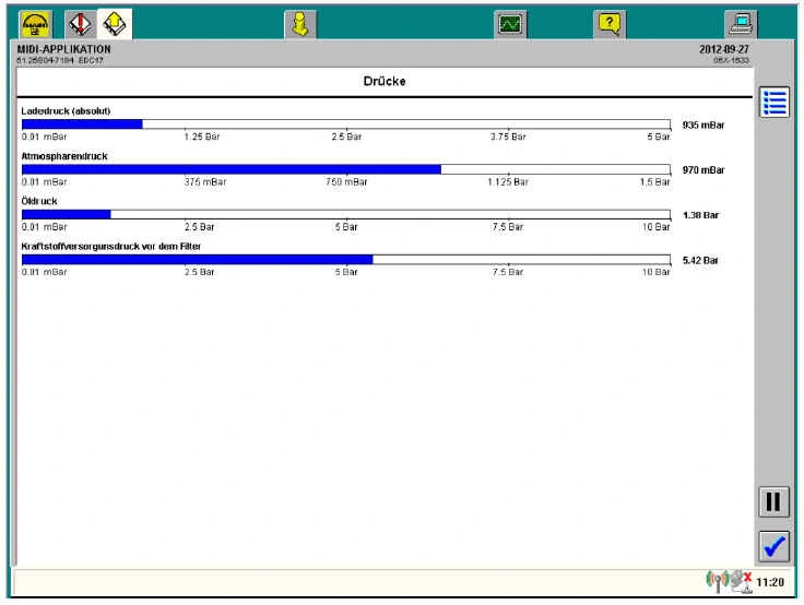 Отображается перепад давления в обеих точках подключения к участку измерения фильтра твердых частиц (фильтровальной системы CRT) для распознавания нагрузки на фильтр, демонтажа или повреждения фильтра и срабатывания регенерации.