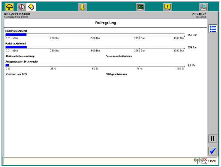 Указание: В исправной системе при пусковом числе оборотов давление топлива должно превысить 3,0 бар за две секунды.