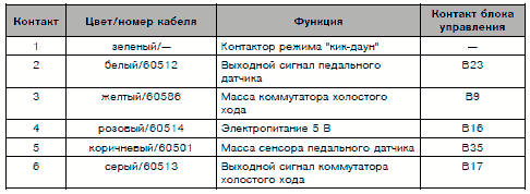 Педальный датчик передает команду водителя дальше на блок управления. В зависимости от положения педали потенциометр определяет значения углового градуса, которые передаются на блок управления в качестве параметров деления напряжения. Положение холостого хода определяется блоком управления через предохранительный выключатель. Через второй выключатель, выключатель режима "кик-даун", информация "режим резкого ускорения "кик-даун" включен" передается на элемент управления коробкой передач.