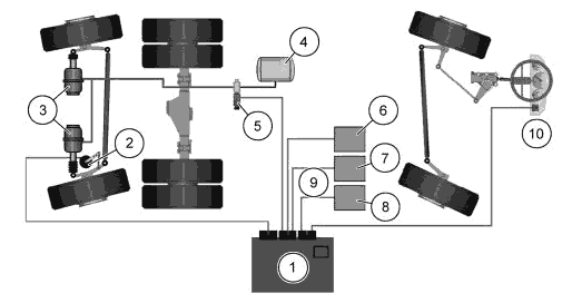 Блок управления (1) вместе с клапаном управления (4) (пропорциональным гидрораспределителем), управляющим цилиндром (3) и датчиком угла поворота (2) заднего поддерживающего моста образует замкнутый контур регулировки. Номинальное значение для регулировки управляемого моста рассчитывается в блоке управления (1) в зависимости от геометрии автомобиля и различных управляющих значений (угла поворота переднего моста, скорости автомобиля).