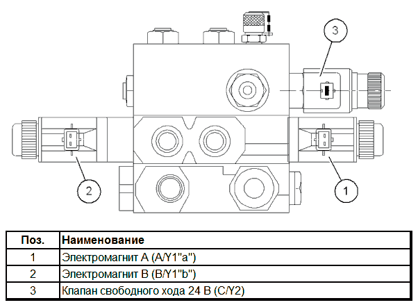 - Регулирует поворот 3-го моста. В обесточенном состоянии клапан пропорционального регулирования закрывается и тем самым блокирует подачу масла в управляющий цилиндр.