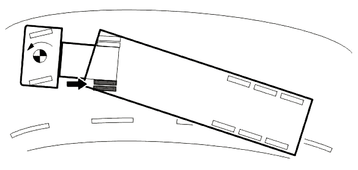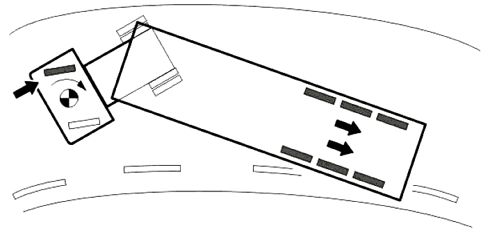 Если автотягач с прицепом недостаточно реагирует на поворот руля при повороте, весь автопоезд будет стремиться двигаться прямо. Передние колеса тягача теряют сцепление с дорогой, а прицеп толкает сзади. В этой ситуации ESP обнаруживает, что положение рулевого колеса не соответствует боковому усилию и углу поворота вокруг вертикальной оси, и система противодействует недостаточной поворачиваемости за счет торможения внутреннего заднего колеса.