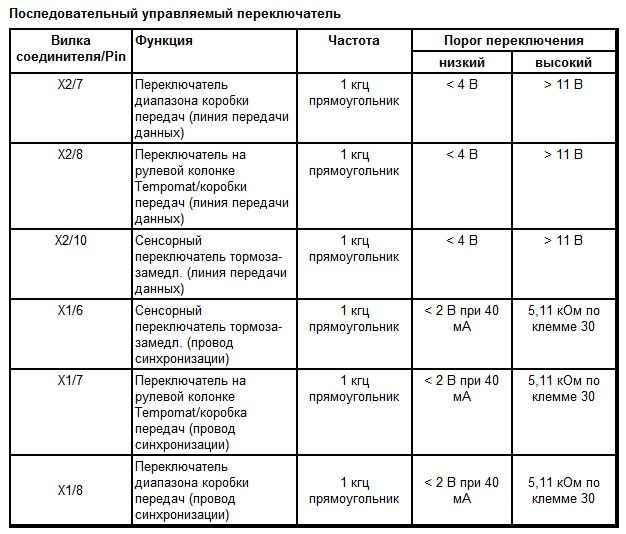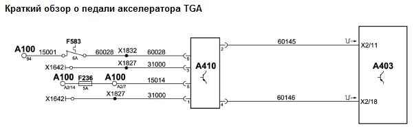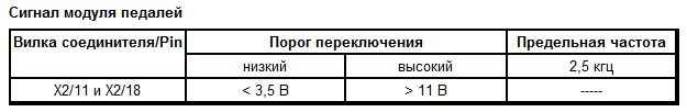 Обратный сигнал положения педали акселератора осуществляется с помощью двух бесконтактных датчиков (датчик Холла). Аналоговые сигналы преобразуются двумя внутренними электронными устройствами в два сигнала PWM. Выходные сигналы PWM соответствуют фактическому положению педали акселератора. Сигнал PWM имеет в положении холостого хода высокую скважность импульсов, которая понижается при полной нагрузке. Второй сигнал PWM имеет в положении холостого хода низкую скважность импульсов, которая увеличивается при полной нагрузке. Имеется резервированная система электрического управления сигналами