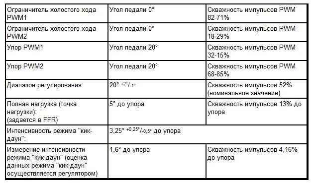 Данные PWM механических упоров сохраняются в виде параметров в ЭСППЗУ автомобильного компьютера (A403), это относится к обоим сигналам PWM. На основе данных PWM1 механических упоров устанавливается стандартное положение педали акселератора. В случае неисправности используются данные PWM2.