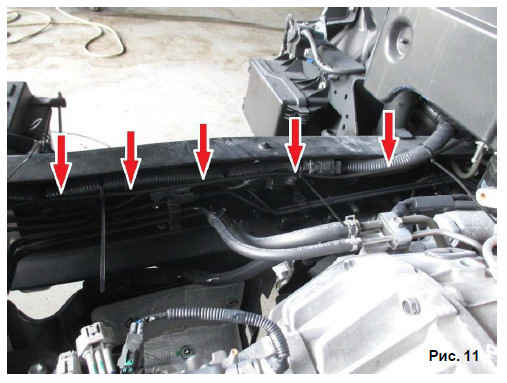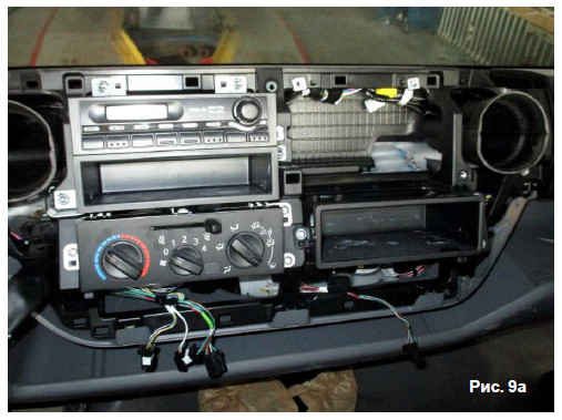 4.1) Разобрать центральную консоль в кабине. По сравнению с рис. 9а рекомендуется дополнительно снять радиоприемник, а также снять нижнюю пластиковую накладку перед сиденьем пассажира.