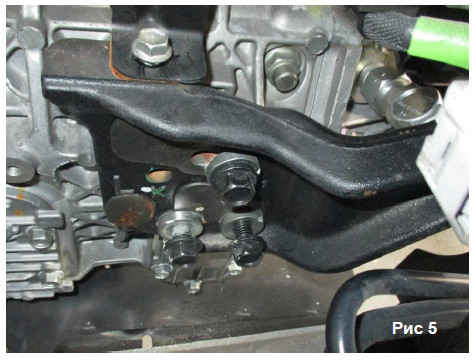 3.1) Выключить замок зажигания, отключить клемму от отрицательного вывода аккумуляторной батареи. 3.2) Ослабить болты крепления левой (по ходу движения автомобиля) опоры коробки передач (рис. 5).