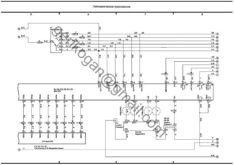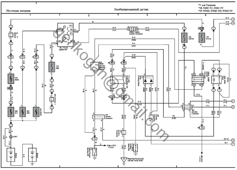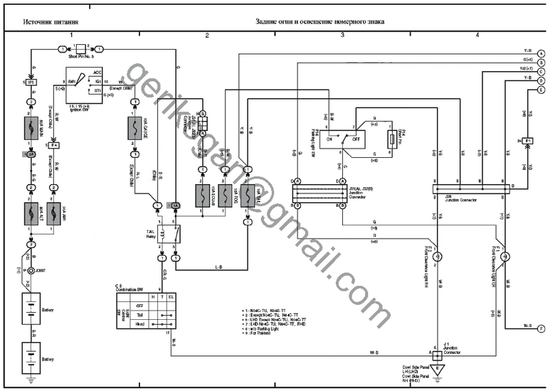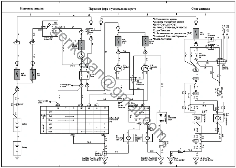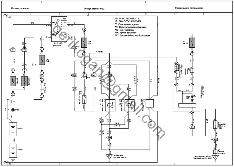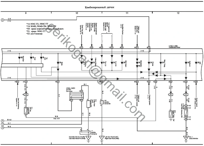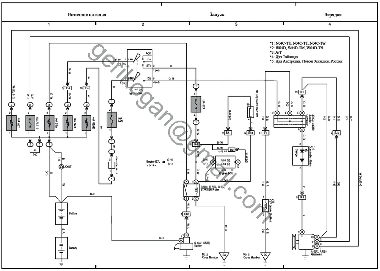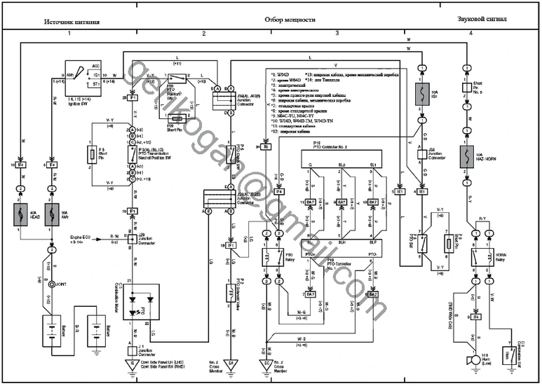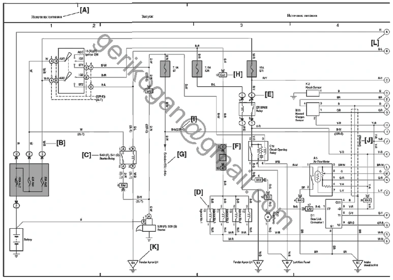 [A]: Название системы [B]: Показывает цвет провода Цвет проводов указан в алфавитном порядке В = черный W = белый BR = коричневый L = синий V = фиолетовый SB = голубой R = красный G = зеленый LG = светло- Р = розовый Y = желтый зеленый О = оранжевый GR = серый Первая буква обозначает двет основного провода, а вторая - цвет жилы. | ![]() |