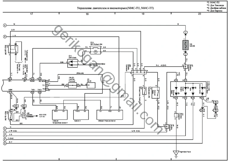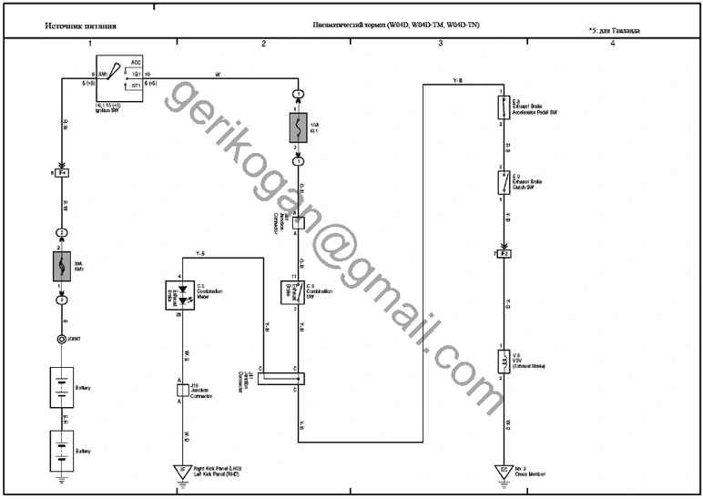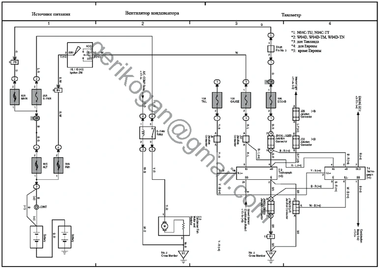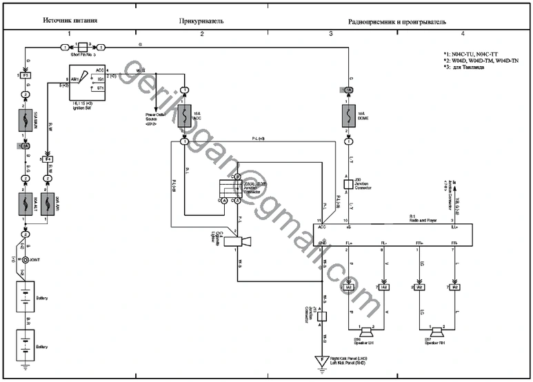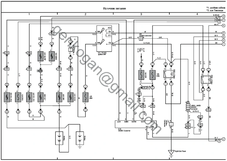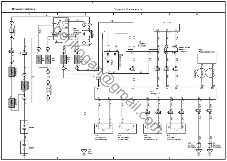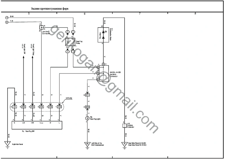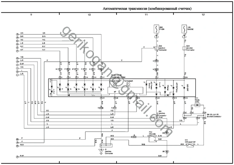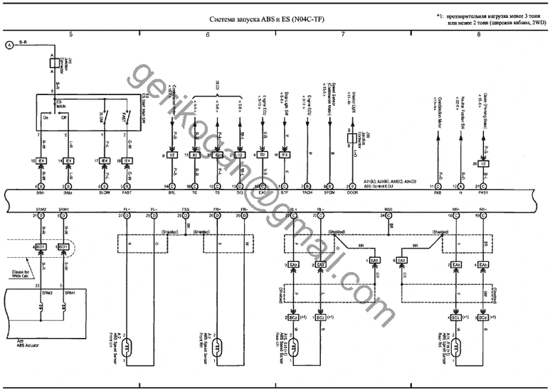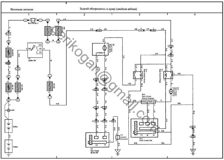 [A]: Название системы [B]: Показывает цвет провода Цвет проводов указан в алфавитном порядке В = черный W = белый BR = коричневый L = синий V = фиолетовый SB = голубой R = красный G = зеленый LG = светло- Р = розовый Y = желтый зеленый О = оранжевый GR = серый Первая буква обозначает двет основного провода, а вторая - цвет жилы. | ![]() |
