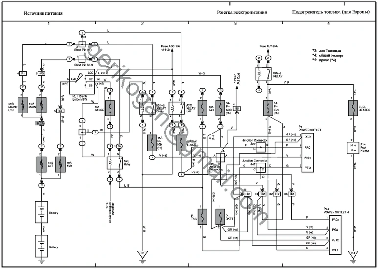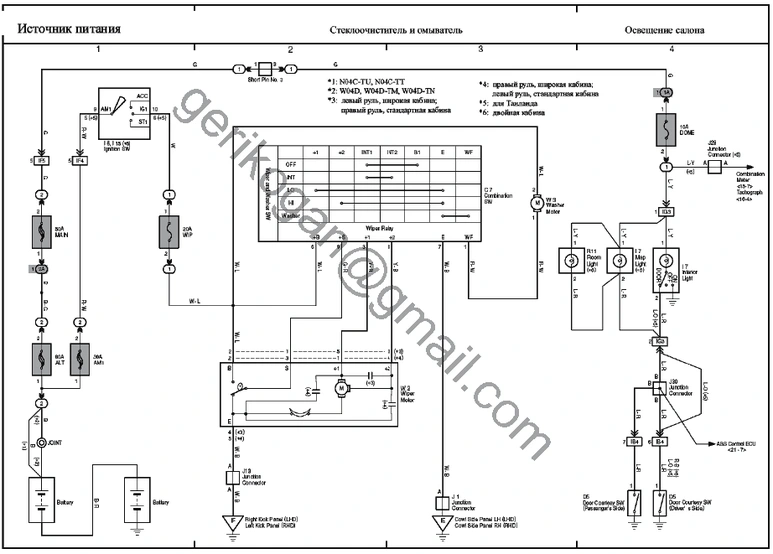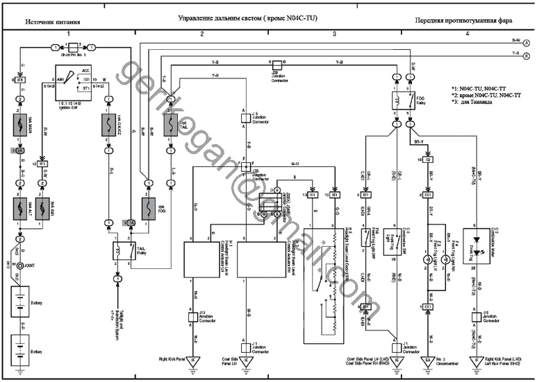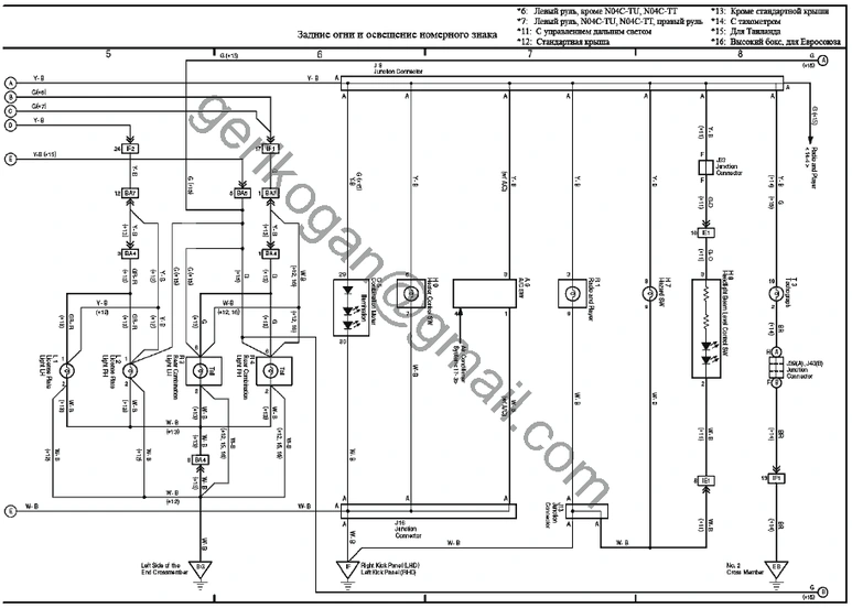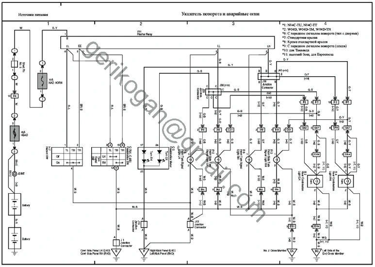 [I]: ( ) используются для обозначения разных проводов и коннекторов, когда модель автомобиля, тип двигателя или спецификация отличаются. [J]: Обозначает армированный кабель. [К]: Обозначает точку заземления и находится на контакте заземления. [L]: Такой код, встречающийся на следующей странице, обозначает неразрывность жгута проводов. | |