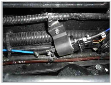 Проложить напорную топливную магистраль вместе с кабельным жгутом от дозирующего насоса к предпусковому подогревателю, фиксируя её пластиковыми хомутами из монтажного комплекта. Подсоединить напорную топливную магистраль к предпусковому подогревателю, зафиксировав соединение хомутами.