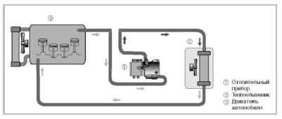 Принципиальная схема подключения предпускового подогревателя к жидкостной системе автомобиля.