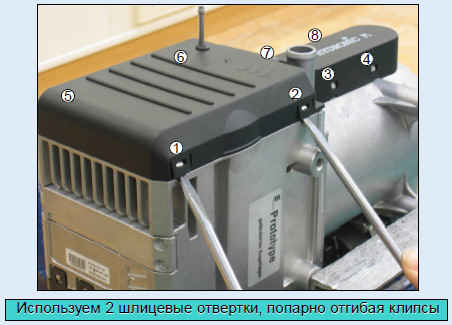 Снимаем крышку нагнетателя. Отгибаем клипсы в данной последовательности