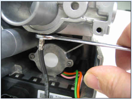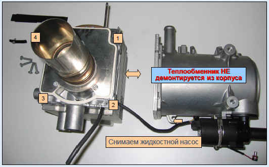 Отделяем корпус (с блоком управления и нагнетателем) от теплообменника, открутив 4 болта