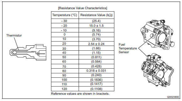 The fuel temperature sensor is a conventional type sensor. Sensor resistance values in relation to fuel temperature are provided below.
