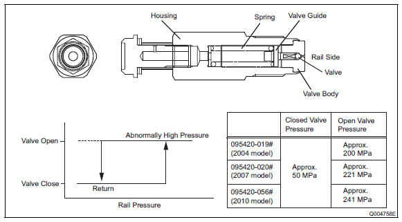 - The construction and operational characteristics of the pressure limiter equipped with the J05D/J08E engines are identical to the conventional limiter. In the event that pressure inside the rail becomes abnormally high, the valve inside the pressure limiter opens to discharge a portion of the fuel. Pressure limiter characteristics are as per the chart below.