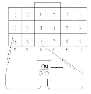 Если сопротивление выходит за допустимые пределы, отсоединить разъем между датчиком и жгутом проводов шасси, проверить, соответствует ли сопротивление датчика норме (как показано на левом рисунке). При отклонении от нормы заменить датчик.