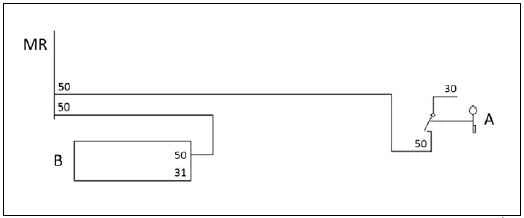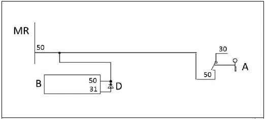 Если прокладка проводки для дополнительного реле невозможна, а аварийные функции аварийного режима при отсутствии функций контроля стартера доступны, возможно еще одно решение: параллельное подключение замка зажигания ко входу блока управления двигателя (MR) и стартеру (B). Для этого в любом случае на вспомогательном реле стартера нужен гасящий диод (D), который бы ограничивал пиковые напряжения. Этот гасящий диод (D) должен иметь соответствующие размеры, чтобы не выйти из строя во всех рабочих состояниях системы. Этот гасящий диод (D) необходимо разместить как можно ближе к реле стартера.