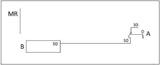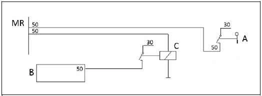 Чтобы обеспечить доступ к функциям аварийного режима и функциям контроля для 12-вольтных систем может быть использовано стандартное решение, однако необходимо промежуточное реле (C), чтобы блок управления двигателя (MR) не вышел из строя.