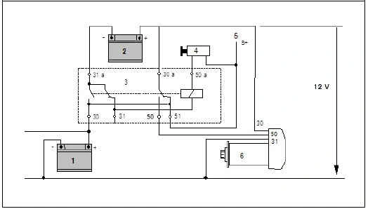 Схема системы пуска двигателя с переключающим реле АКБ