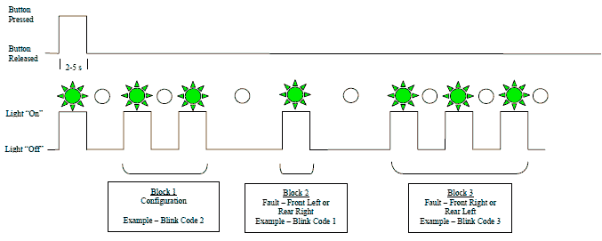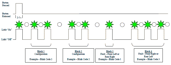 - Вторая последовательность вспышек указывает на неисправности в передних правых или задних правых датчиках или модуляторах.
