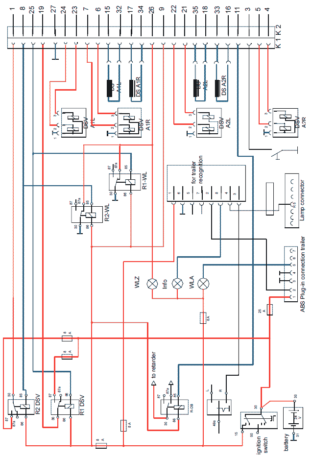 1 – К замедлителю; 2 – Выключатель зажигания; 3 – Аккумуляторная батарея; 4 – Информационная лампа; 5 – Разъем соединительной головки системы ABS прицепа; 6 – Для идентификации прицепа; 7 – Разъем кабеля питания ламп прицепа