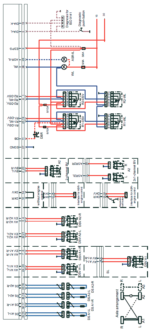 1 - Колёсная характеристика; 2 – Без системы управления двигателем; 3 – Подключения системы управления двигателем к противобуксовочной системе ASR; 4 - Кнопка диагностики; 5 - Интерфейс для подключения системы управления двигателем к противобуксовочной системе ASR; 6 – Двухканальный тормозной клапан; 7 – 2 одноканальных тормозных клапана; 8 –Диагностический разъем согласно ISO 9141; 9 - Кнопка диагностики