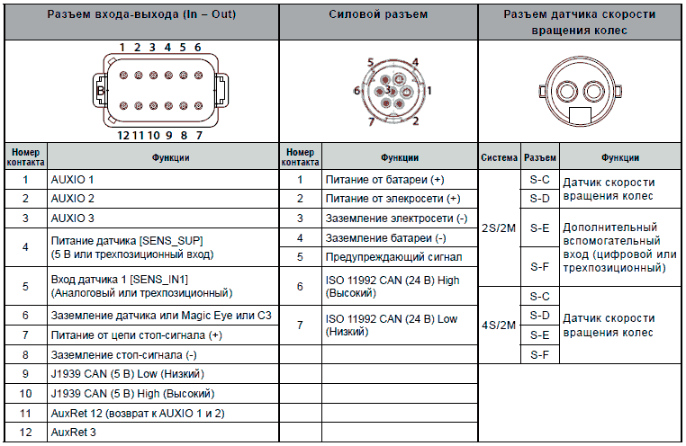 ниже. Этими сигналами можно управлять при помощи двух трехпозиционных входов, доступных на разъеме IN/OUT, портах E и F на разъеме датчика скорости вращения колес или портах AUXIO 1-3 (для получения подробной информации о функциях отдельных разъемов и контактов.