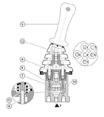При отклонении рычага управления (5) плунжер (9) толкает пружину возврата (8) и управляющую пружину (7). Управляющая пружина (7) сначала смещает регулирую-щий золотник (6) вниз и перекрывает соединение между соответствующим портом и портом резервуара T. Отдновременно соответствующий порт сообщается с портом P посредством высверленного отверстия (11). Фаза управления начинается, как только регулирующий золотник (6) сбалансирует силу давления управляющей пружины (7) и результирующей силы гидравлического давления на соответствующем порте (порты 1, 2, 3 или 4).