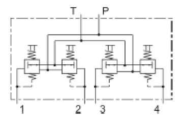Когда рычаг управления не включен, в нулевом положении его удерживают четыре пружины возврата (8). Порты управления (1, 2, 3, 4) соединены с портом резервуара T посредством высверленного отверстия (11).