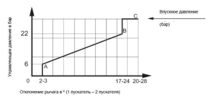 Благодаря взаимодействию регулирующего золотника (6) и управляющей пружины (7) давление на соответствующих портах пропорционально ходу плунжера (9) и, соответственно, положению рычага управления (5).