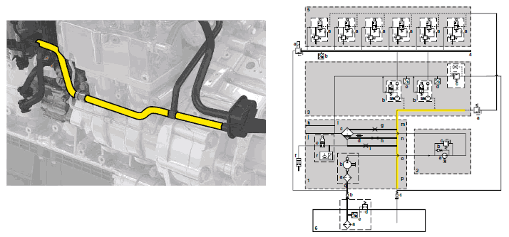 поступает от модуля фильтрации обратно в бак через отсечной клапан (бс). Отсечные клапаны (6b и 6с) открываются, когда подсоединены топливопроводы. При отсоединении топливопроводов, проходящих между двигателем и шасси, клапаны закрываются.