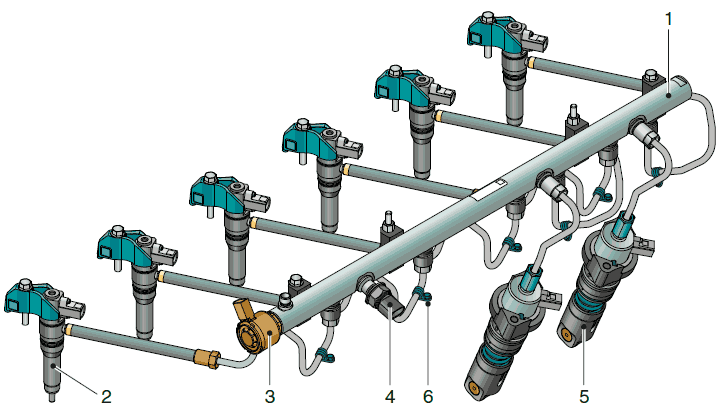 Система высокого давления включает в себя топливный аккумулятор высокого давления (топливораспределительная рампа, 1), который подсоединяется к 6 форсункам с электромагнитными клапанами (2), устанавливаемым в головку блока цилиндров.