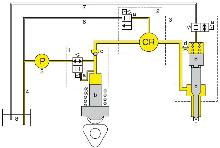 Топливо перемещается из бака (8) по линии подачи (4) с помощью топливоподкачивающего насоса (5) в насосный агрегат высокого давления (1). Если дозирующий клапан на выходе в насосном агрегате не активирован, топливо закачивается обратно в линию подачи топлива. Если дозирующий клапан на выходе (1а) в насосном агрегате задействован, возвратная линия закрывается, и топливо закачивается под высоким давлением в топливораспределительную рампу (2) через обратный клапан (1с). Когда ECU активирует электромагнитный клапан в форсунке (3), происходит впрыск топлива.