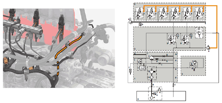 Слив из форсунок: топливо поступает из канала в головке блока цилиндров и внешней стальной линии в возвратный канал топлива в блоке цилиндров двигателя. Соединение оснащено клапаном обратного слива форсунки (3a). Клапан обратного слива форсунки служит для предотвращения попадания топлива в блок цилиндров при выдвижении форсунки в случае, если в топливном баке еще осталось давление. Еще одно назначение обратного клапана состоит в том, чтобы поддерживать давление топлива в возвратном канале головки блока цилиндров для предотвращения образования пустот в