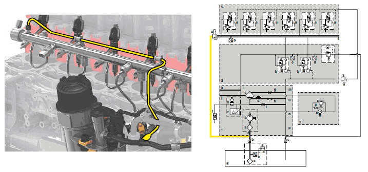 блок цилиндров двигателя для подачи топлива под высоким давлением в топливораспределительную рампу. Давление в рампе управляется насосными агрегатами топливораспределительной рампы (5) и