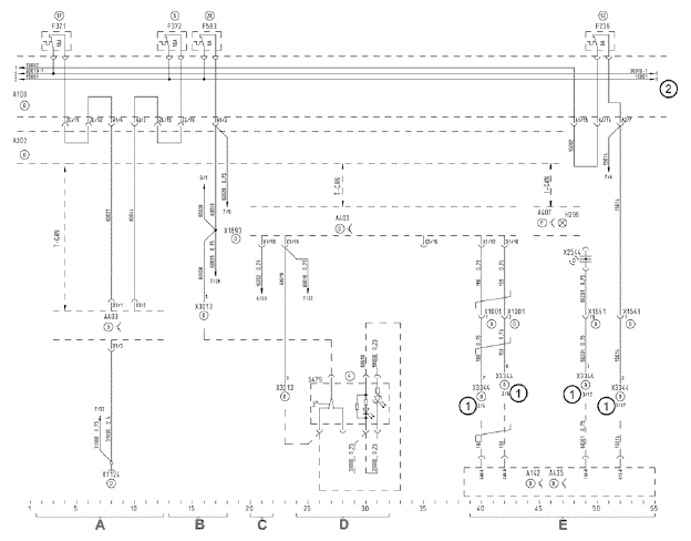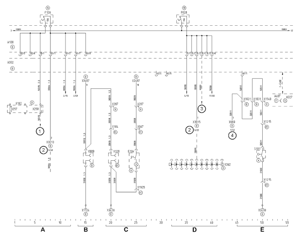 A = электропитание постоянно включённого потребителя / B = штекерный разъём основной приборной панели / C = освещение двигателя, штекерный разъем, приборный отсек / D = электропитание +15 / E = блокирование стартера