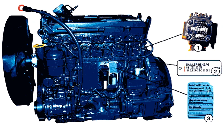 1 - топливный насосный блок; 2 - заводская табличка двигателя; 3 - опознавательная наклейка блока.